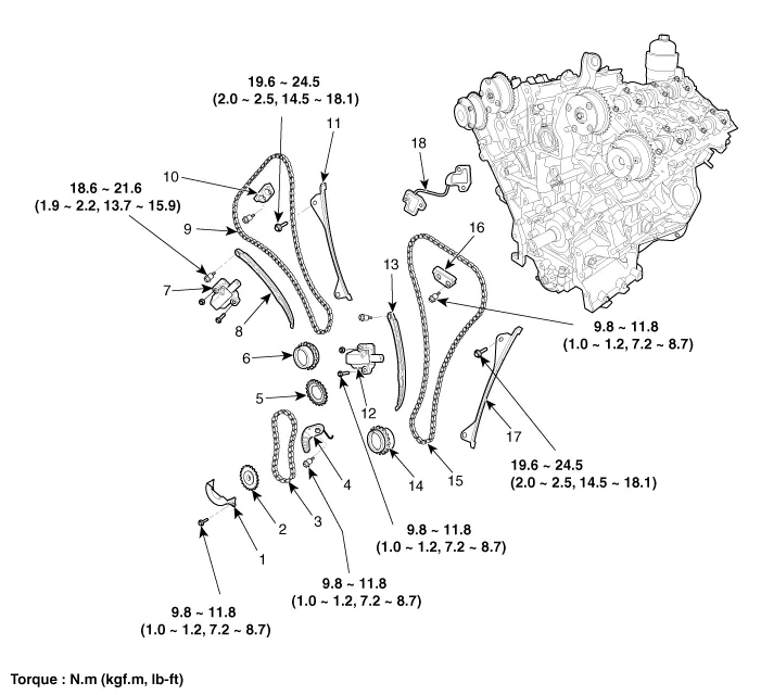 | 1. Oil pump chain cover 2. Oil pump sprocket 3. Oil pump chain 4. Oil pump tensioner assembly 5. Crankshaft oil pump sprocket 6. Crankshaft RH chain sprocket | 7. RH Timing chain auto tensioner 8. RH Timing chain tensioner arm 9. RH Timing chain 10. RH Timing chain cam to cam guide 11. RH Timing chain guide 12. LH Timing chain auto tensioner | 13. LH Timing chain tensioner arm 14. Crankshaft LH chain sprocket 15. LH Timing chain 16. LH Timing chain cam to cam guide 17. LH Timing chain guide 18. Tensioner adapter |