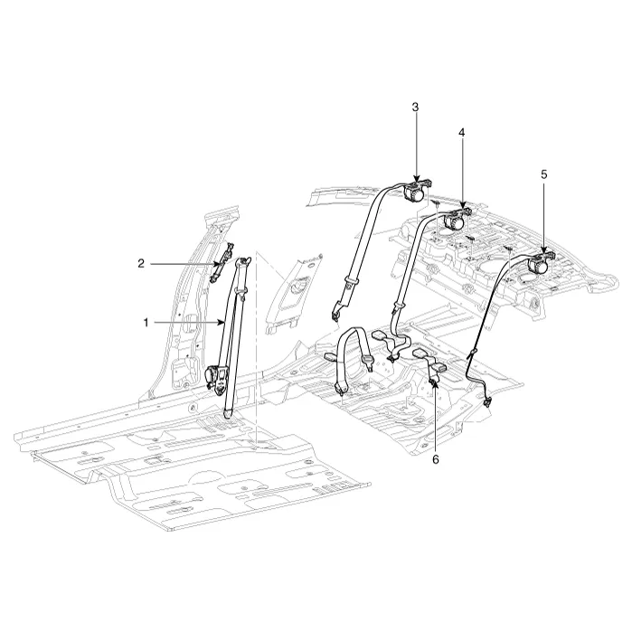| 1. Front seat belt 2. Height adjuster 3. Rear seat belt (RH) | 4. Rear center seat belt 5. Rear seat belt (LH) 6. Rear center seat belt buckle |