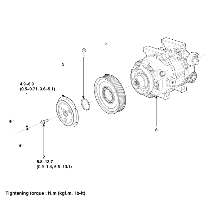 | 1. Screw 2. Blot 3. Limiter Assembly | 4. Retainer Ring 5. Pulley 6. Compressor Assembly |