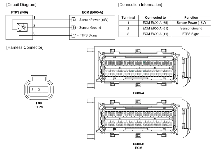 Inspection 1. Connect the GDS on the Data Link Connector (DLC). 2. Measure the output voltage of the FTPS. Specification: Refer to "Specification" Removal 1.