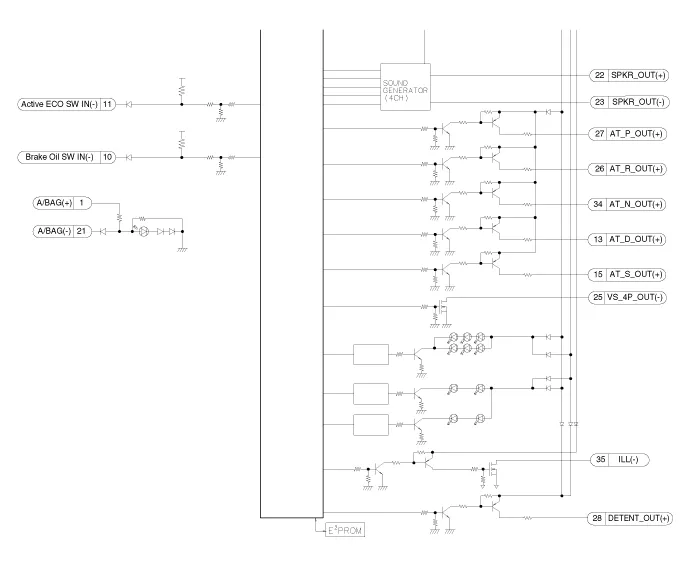 Components Connector Pin Information No.DescriptionNo.Description1Air bag (+)21Aig bag (-)2Trip switch (+)22Speaker output (+)3Cruise switch (+)23Speaker output (-)4Rheostat down switch (-)24Trip switch (-)5Rheostat up switch (-)25VS 4P output (-)6Oil pressure (-)26AT R output (+)7Washer indicator (-)27AT P output (+)8Battery charge (-)28Detent output (+)9H/SWHL indicator (+)29Immobilizer (-)10Brake oil switch (-)30MM CAN high11Active ECO switch (-)31MM CAN low12Driving mode switch (-)32C CAN low13AT D output (+)33C CAN high14Fuel (+)34AT N output (+)15AT S output (+)(AT)35Illumniation (-)16Fuel (-)36P ground17-37S ground18Glass status signal (-)38-19-39IGN 1 (+)20Illumination (+)40Battery (+)