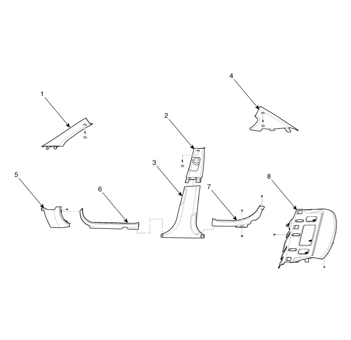 | 1. Front pillar trim 2. Center pillar upper trim 3. Center pillar lower trim 4. Rear pillar trim | 5. Cowl side trim 6. Front door scuff trim 7. Rear door scuff trim 8. Rear package tray trim |