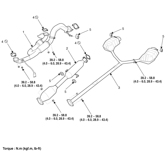 | 1. Front muffler 2. Catalytic converter & center muffler assembly 3. Main muffler | 4. Gasket 5. Hanger |