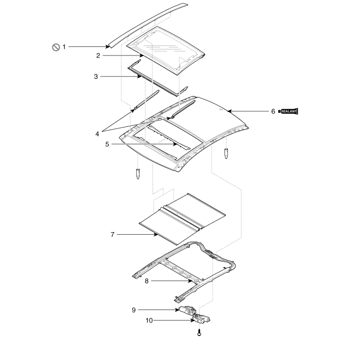 | 1. Roof moulding 2. Movable glass 3. Wind deflector 4. Folding cover assembly 5. Front cover assembly | 6. Panoramaroof frame assembly 7. Roller blind assembly 8. Mechanism assembly 9. Movable glass motor assembly 10. Roller blind motor assembly |