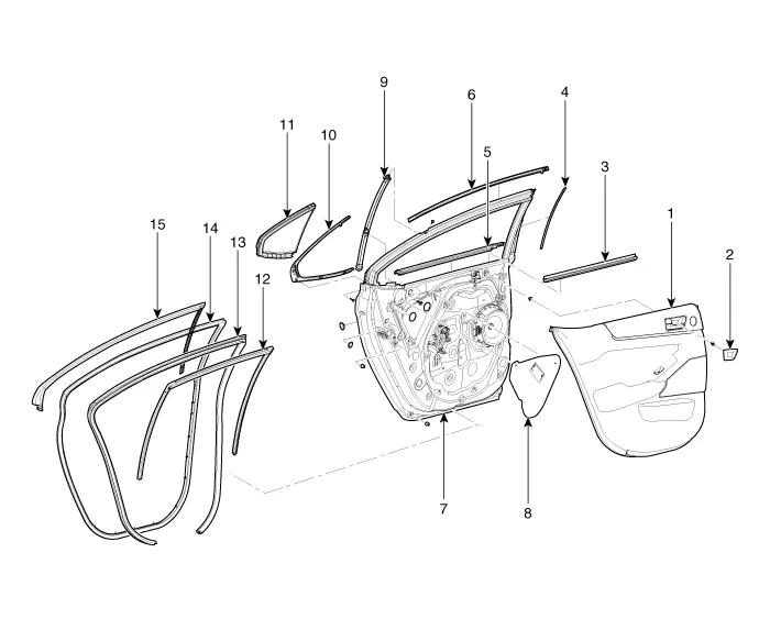 | 1. Rear door trim 2. Rear inside handle cap 3. Rear door belt inner weatherstrip 4. Rear door side weatherstrip mounting moulding 5. Rear door belt outside weatherstrip 6. Rear door frame moulding 7. Rear door panel 8. Rear door seal | 9. Rear door DIV channel 10. Rear door frame rear moulding 11. Rear door fixed glass weatherstrip 12. Rear door glass run 13. Rear door body side weatherstrip 14. Rear door side weatherstrip 15. Rear door upper weatherstrip |