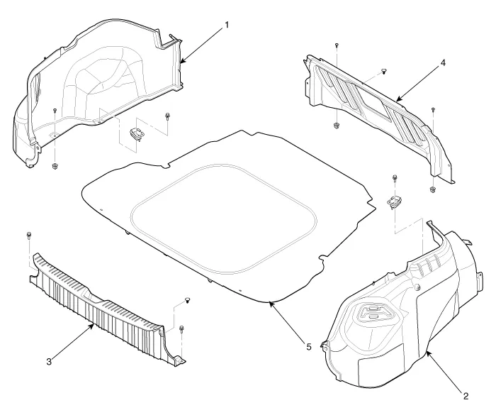 | 1. Luggage side trim (LH) 2. Luggage side trim (RH) 3. Rear transverse trim | 4. Partition lower trim 5. Luggage covering mat & board |