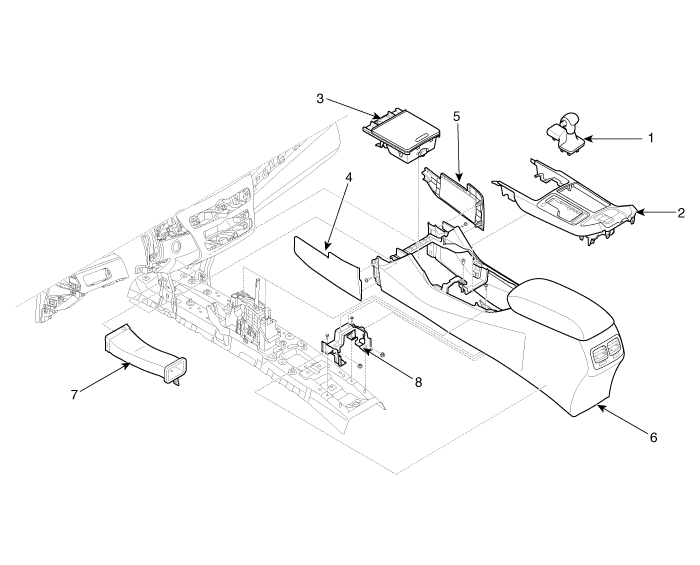 | 1. Gear knob & boots 2. Floor console upper cover 3. Floor console upper cover tray 4. Console side cover [LH] | 5. Console side cover [RH] 6. Floor console assembly 7. Rear air vent duct 8. Console rear mounting bracket |