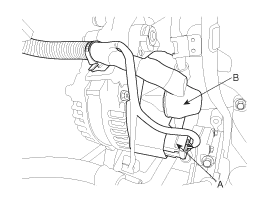 Disconnect the alternator connector (A) and cable (B) from the ''B'' terminal.