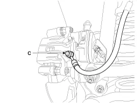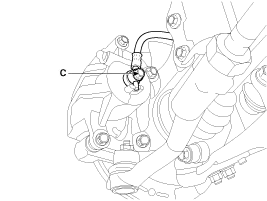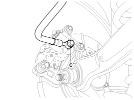 Disconnect the brake hose from the brake caliper by loosening the bolt (C).