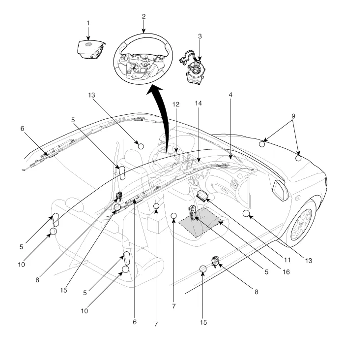 | 1. Driver Airbag (DAB) 2. Steering Wheel 3. Clock Spring 4. Passenger Airbag (PAB) 5. Side Airbag (SAB) 6. Curtain Airbag (CAB) 7. Seat Belt Buckle Switch (BS) 8. Seat Belt Pretensioner (BPT) | 9. Front Impact Sensor (FIS) 10. Rear Side Impact Sensor (RSIS) 11. Supplemental Restraint System Control Module (SRSCM) 12. Airbag Warning Lamp 13. Pressure Side Impact Sensor (P-SIS) 14. Telltale Lamp 15. Anchor Pretensioner (APT) 16. Occupant Detection System (ODS) |