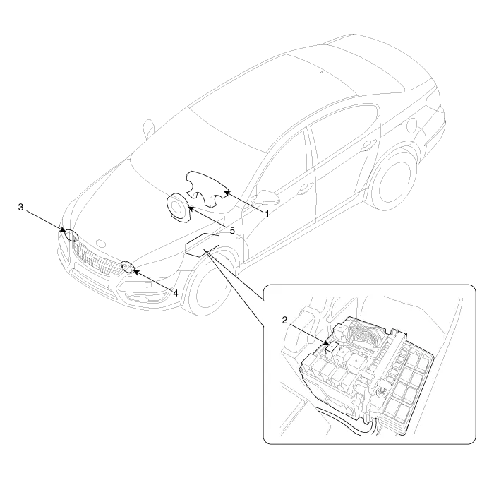 | 1. Horn switch 2. Horn relay (Engine room compartment) 3. Horn - High pitch | 4. Horn - Low pitch 5. Clock spring |