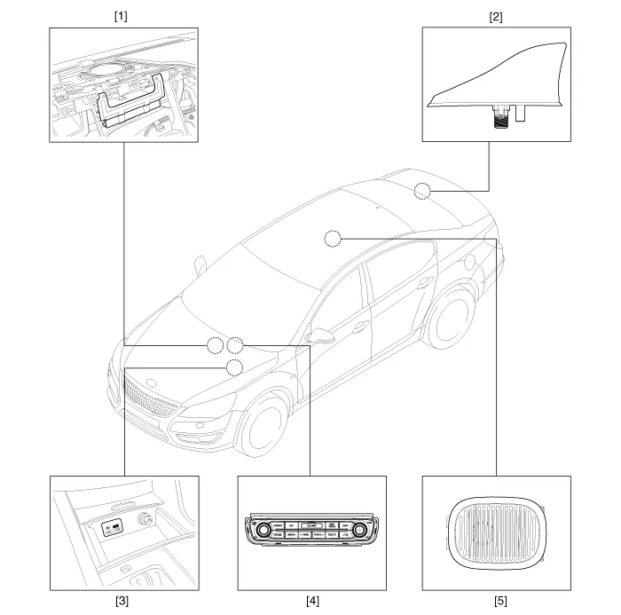 | 1. Telematics unit (TMU) 2. Roof Antenna 3. AUX jack | 4. AVN head unit 5. Mic |
