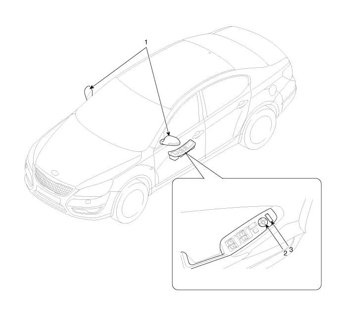 | 1. Power door mirror 2. Power door mirror switch | 3. Power folding mirror switch |