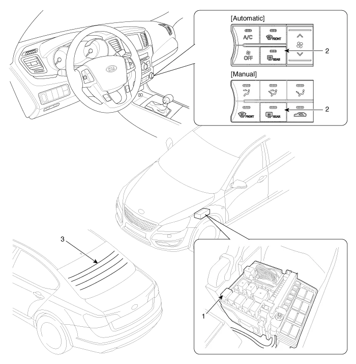 | 1. Rear glass defogger relay (Engine room relay box) 2. Rear glass defogger switch (A/C controller) | 3. Rear glass defogger |