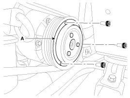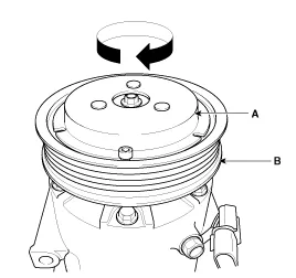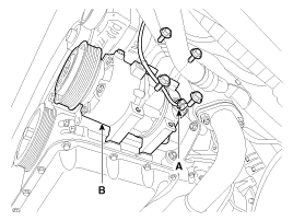 6. Disconnect the compressor clutch connector (A), and then remove 4 mounting bolts and the compressor(B).