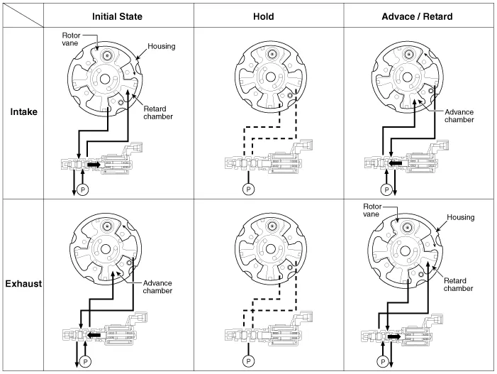 | (3) Low Speed /High Load | Retard | * Increase of expansion work | Advance | * Prevention of intake back flow (Improvement of volumetric efficiency) |