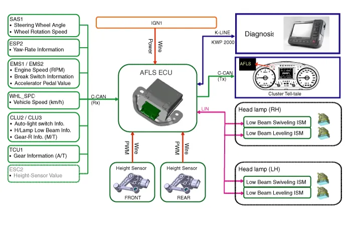 Vehicle having the Steel-suspension system transmits inclination signal to AFLS ECU by using Hard-wire. |