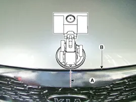 Install the target jig at the end of the hood (B) after alighting the center (A) of the target jig and emblem.