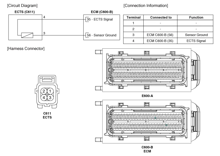 Inspection 1. Turn the ignition switch OFF. 2. Disconnect the ECTS connector. 3. Remove the ECTS (Refer to "Removal"). 4. After immersing the thermistor of the sensor into engine coolant, measure resistance between the ECTS terminals 3 and 4.