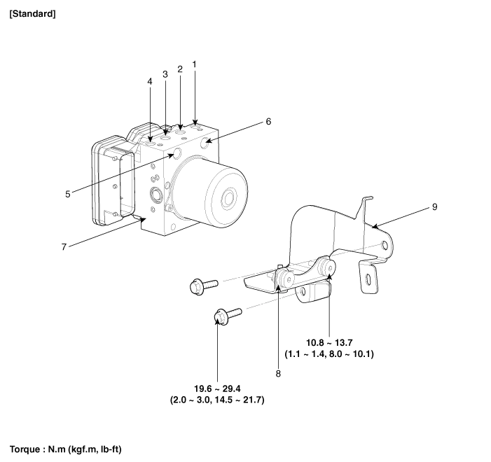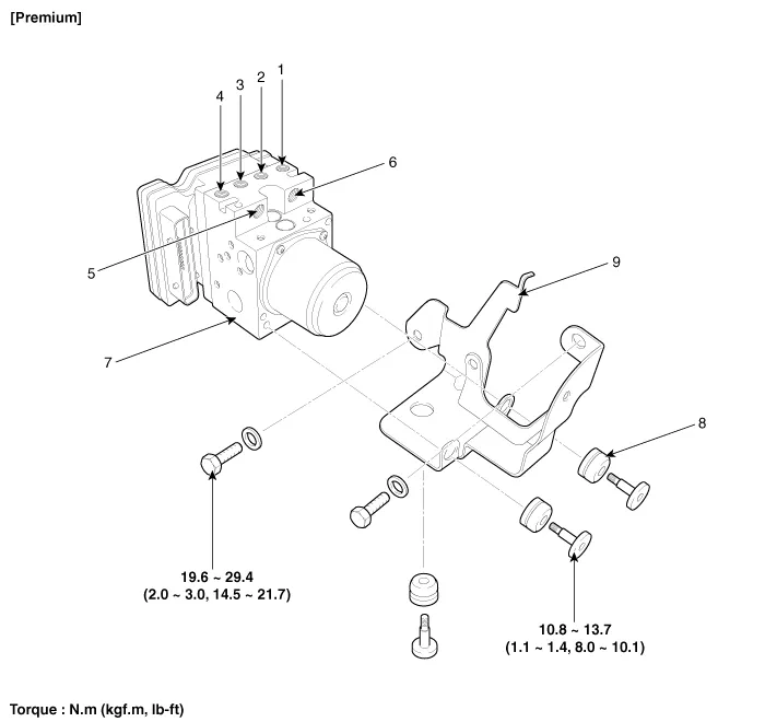 | 1. Front - left tube 2. Rear - right tube 3. Rear - left tube 4. Front - right tube 5. MC2 | 6. MC1 7. ESC control module (HECU) 8. Damper 9. Bracket |