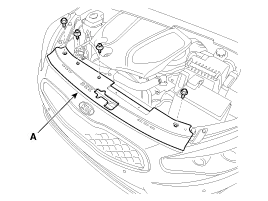 After loosening the mounting bolts and clips, then remove the radiator grill upper guide (A).