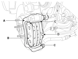 Replace pad shim (D), pad retainers (C) and brake pads (B) in the caliper carrier (A).
