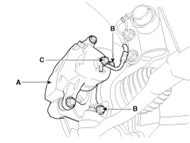 Loosen the hose eyebolt (C) and caliper mounting bolts (B), then remove the front caliper assembly (A).