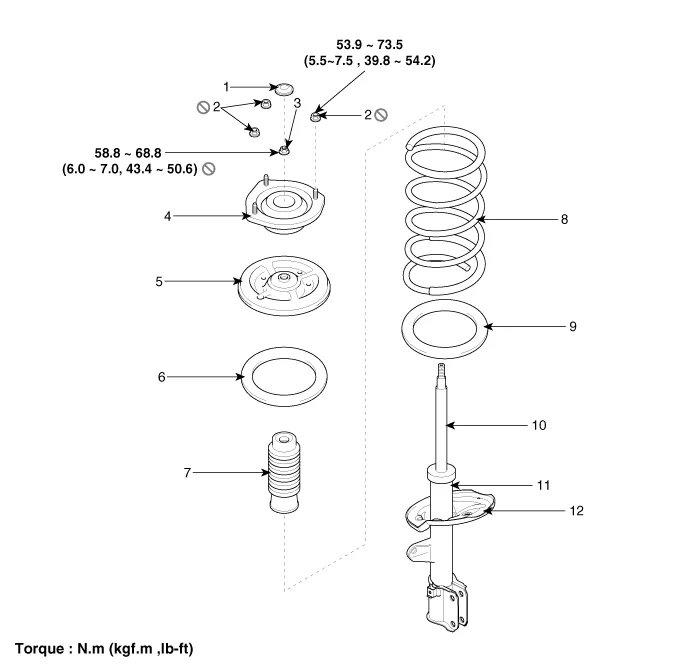 | 1. Insulator cap 2. Upper locking nut 3. Self locking nut 4. Insulator 5. Strut bearing 6. Spring upper pad | 7. Strut dust cover & Bumper rubber 8. Coil spring 9. Spring lower pad 10. Piston rod 11. Strut assembly 12. Spring lower seat |