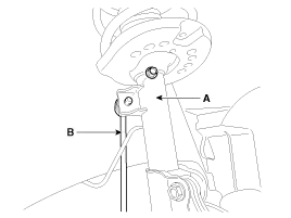 Remove the brake hose (A) & wheel speed sensor bracket (B) from the front strut assembly by loosening mounting bolts.