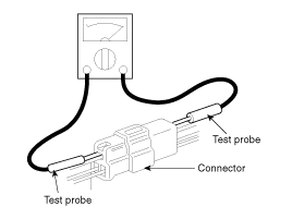 When using a circuit tester to check continuity or voltage on connector terminals, insert the test probe into the harness side. If the connector is a sealed connector, insert the test probe through the hole in the rubber cap until contacts the terminal, being careful not to damage the insulation of the wires.