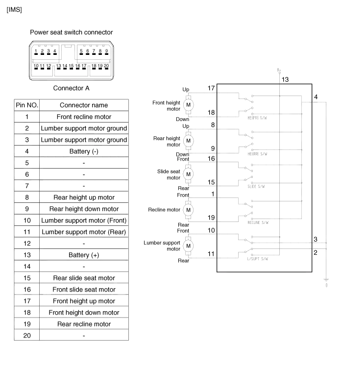 Inspection 1. Disconnect the IMS control switch connector. 2. With the power IMS control switch in each position, make sure that continuity exists between the terminals below.