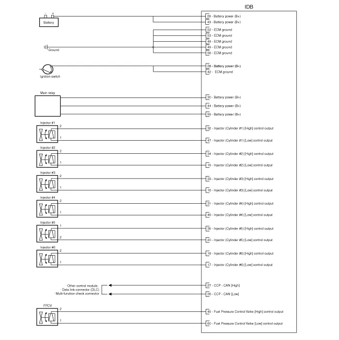 | 40 | Injector (Cylinder #6) signal input | Engine Control Module (ECM) |