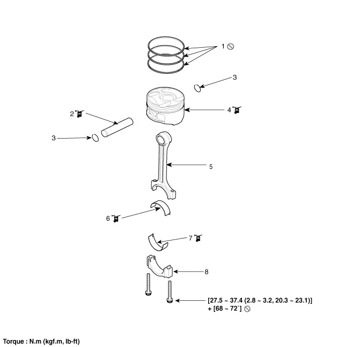 | 1. Piston ring 2. Piston pin 3. Snap ring 4. Piston | 5. Connecting rod 6. Connecting rod upper bearing 7. Connecting rod lower bearing 8. Connecting rod bearing cap |