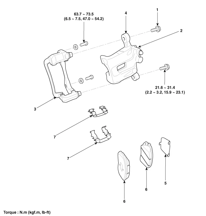 | 1. Guide rod bolt 2. Bleed screw 3. Caliper carrier 4. Caliper body | 5. Inner pad shim 6. Brake pad 7. Pad retainer |