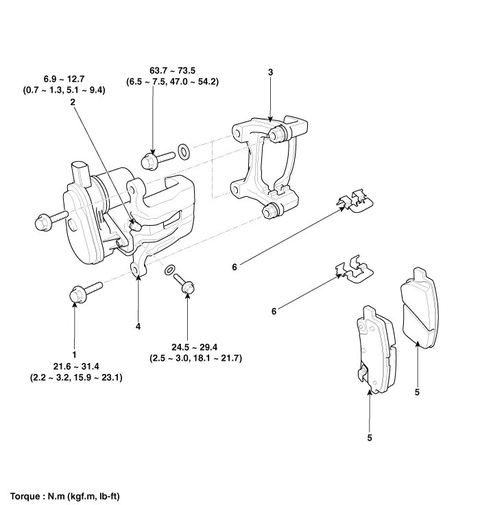 Removal 1. Remove the rear wheel & tire. Tightening torque: 88.3 ~ 107.9 N.m (9.0 ~ 11.0 kgf.m, 65.1 ~ 79.6 lb-ft) 2. Release the parking brake.
