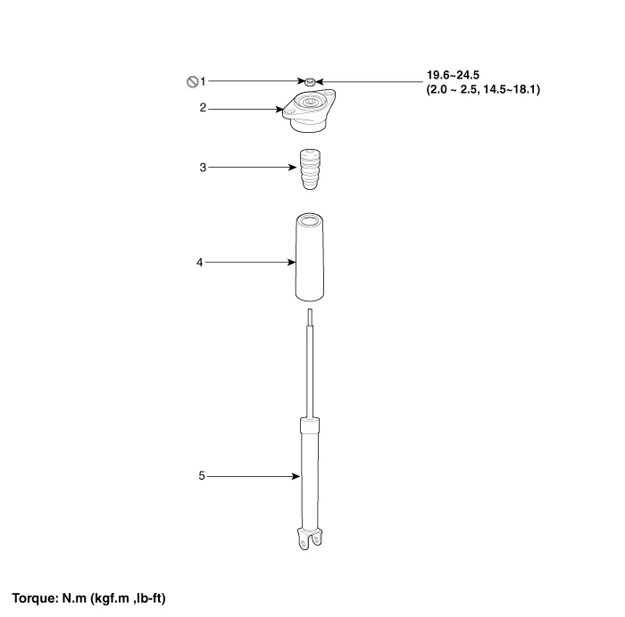 | 1. Self locking nut 2. Bracket assembly 3. Bumper rubber | 4. Dust cover 5. Shock absorber |