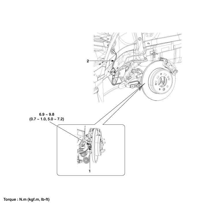 | 1. Rear wheel speed sensor 2. Rear wheel speed sensor cable |