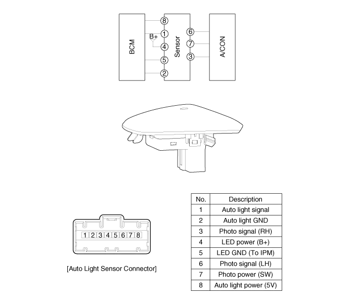 Description 1. The photo sensor is located at the center of defrost nozzle. 2. The photo sensor contains a photovoltaic (sensitive to sunlight) diode. The solar radiation received by its light receiving portion, generates an electromotive force in proportion to the amount of radiation received which is transferred to the automatic tem