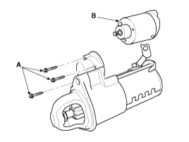 After loosening the 3 screws (A), detach the starter solenoid assembly (B).
