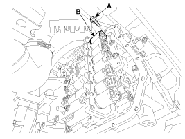 Remove the solenoid valve harness (A) and oil temperature sensor (B) after removing the bolts.