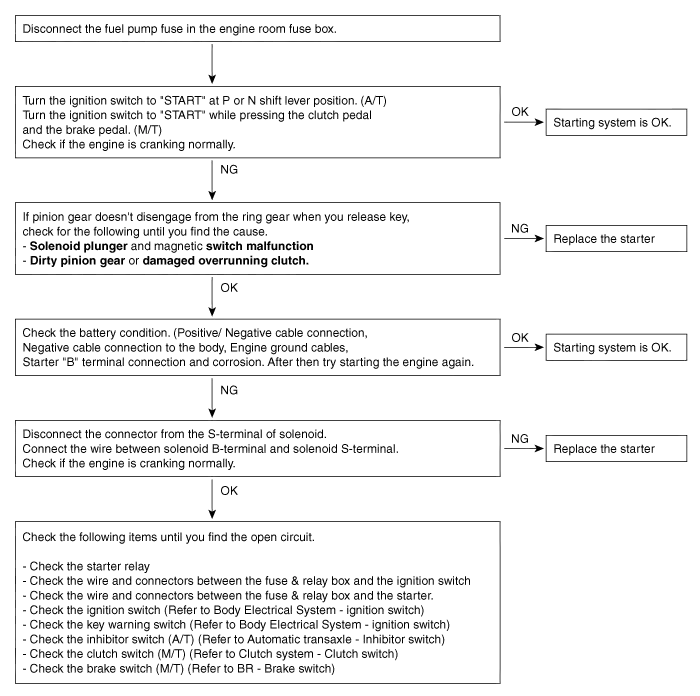 Description The starting system includes the battery, starter, solenoid switch, ignition switch, inhibitor switch (A/T), clutch pedal switch (M/T), ignition lock switch, connection wires and the battery cable.