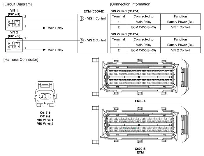 Inspection 1. Turn the ignition switch OFF. 2. Disconnect the VIS valve connector. 3. Measure resistance between the VIS valve terminals 1 and 2.